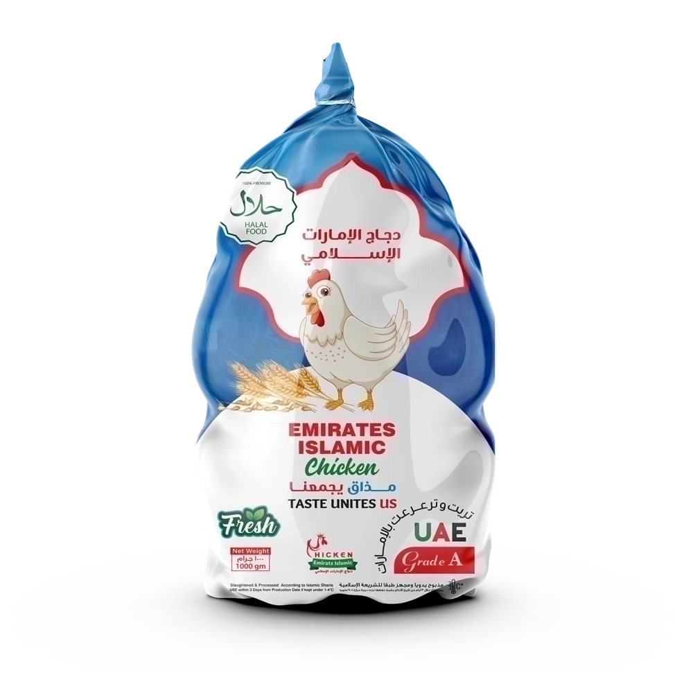 Emirates Islamic whole chicken, fresh and hand-slaughtered according to the highest halal standards, perfect for preparing your family's meals with authentic flavors.