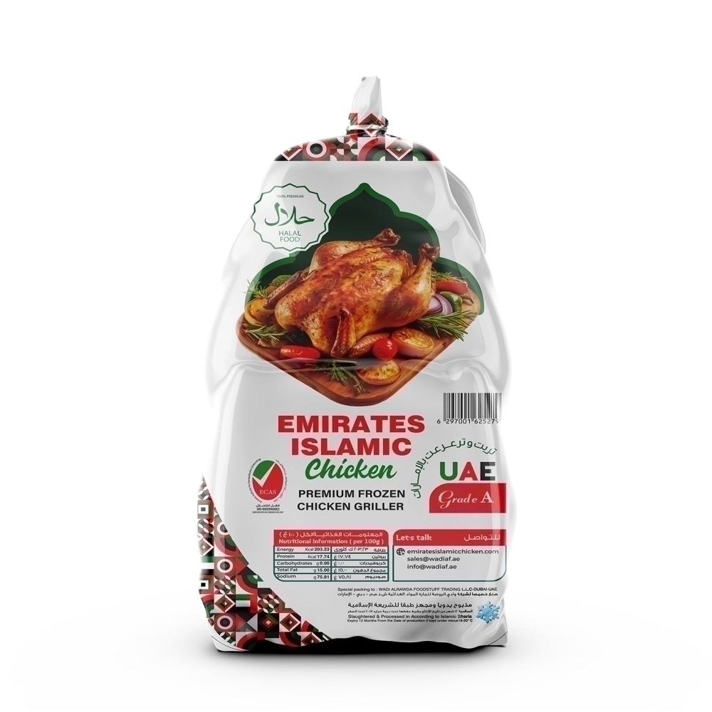 Emirates Islamic Chicken, frozen and hand-slaughtered to the highest halal standards. Produced in UAE farms, it's the ideal choice for preparing authentic family meals.